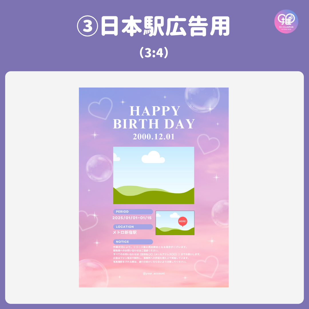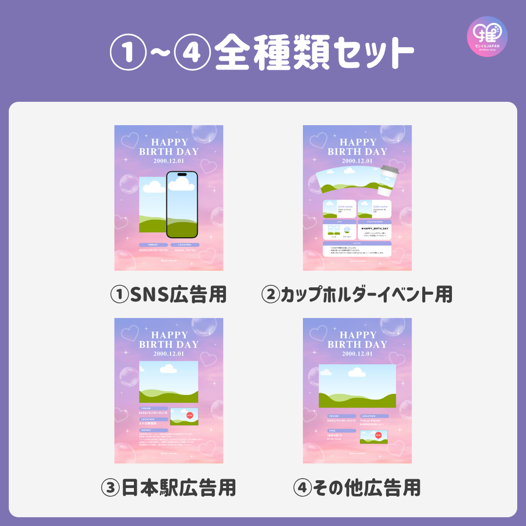 サイズ | ①SNS広告用(3:4) ②カップホルダーイベント用(3:4) ③日本駅広告用(3:4) ④その他広告用(3:4) |