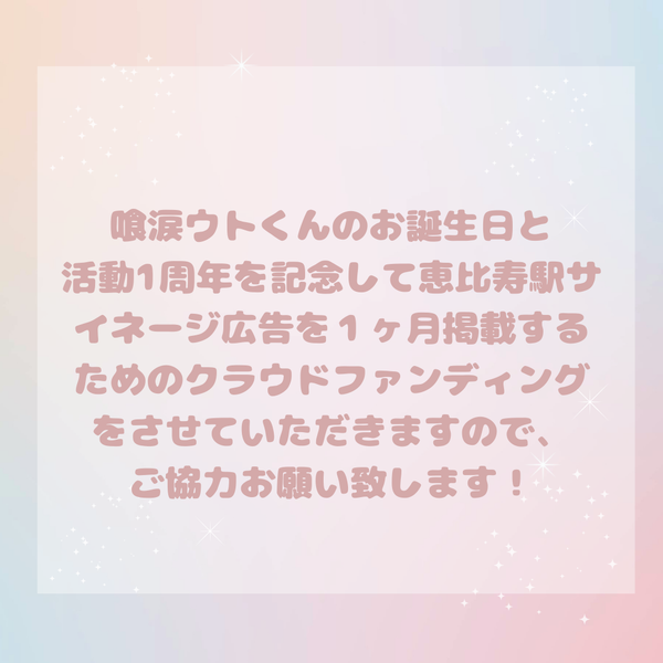 第一目標である応援広告は喰涙ウトくんのお誕生日&活動1周年記念に3月中東京某駅サイネージに掲示する予定です。